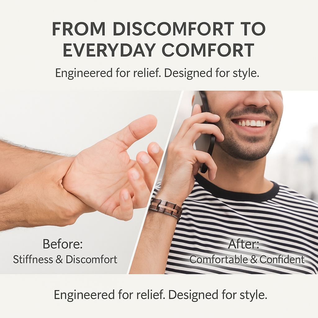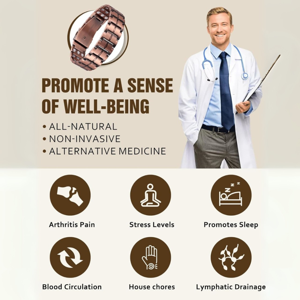 The copper bracelet helps improve circulation, alleviate discomfort, and promote overall well-being.